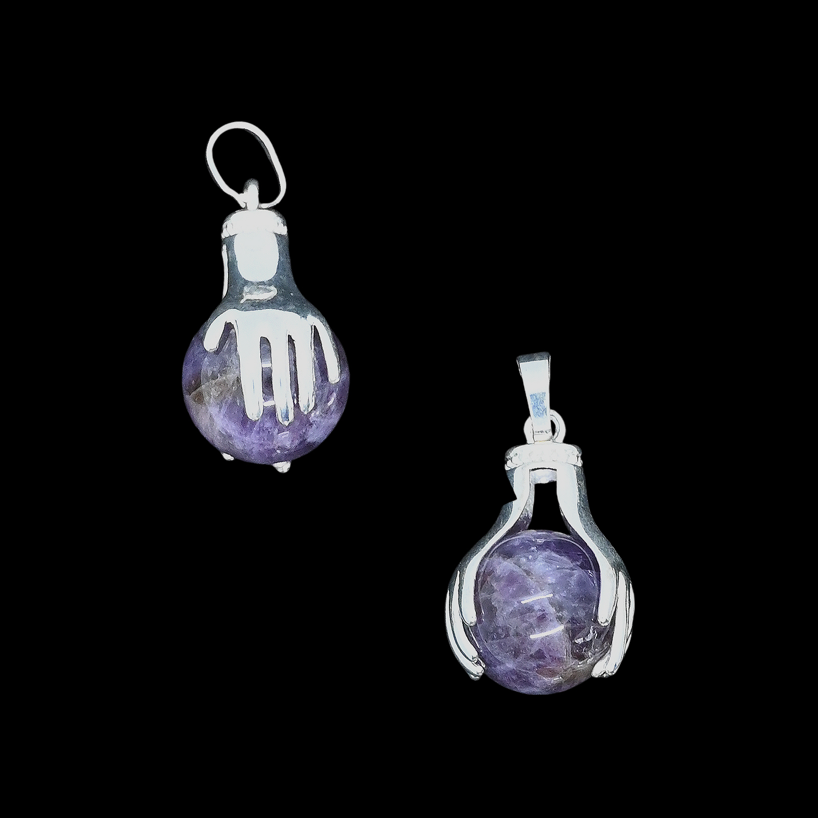 Anhänger mit Händen die eine bewegliche Amethyst Steinkugel halten