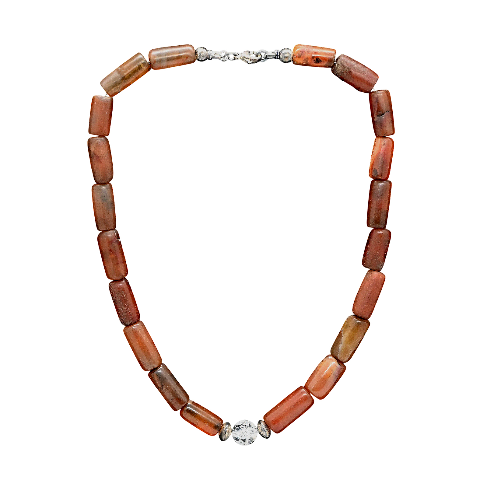 Erleben Sie ein Stück Natur mit dieser einzigartigen Halskette, die mit alten, gebohrten Carneol in Stäbchenform und einem funkelnden Eis Bergkristall besticht. Die Kette, eine perfekte Mischung aus Statement und Collier, verfügt über eine Länge von 43 cm und ist aus 20 Carneolen in den Größen von 16mm bis 20mm und einem Bergkristall 9mm zusammengesetzt. Die Trommelsteine sind sorgfältig ausgewählt und behandelt, um ihren natürlichen Charme zu bewahren. Gefertigt in Deutschland, präsentiert sich dieses Schmuckstück in einem warmen Braun- Rotton, der durch den matten Schliff des Carneols unterstrichen wird. Der Karabinerverschluss bietet sicheren Halt, während die Kette Ihnen bein fällen . Eine Halskette, die nicht nur durch ihre Herstellungsqualität, sondern auch durch ihre handwerkliche Finesse besticht. Einzellstück.