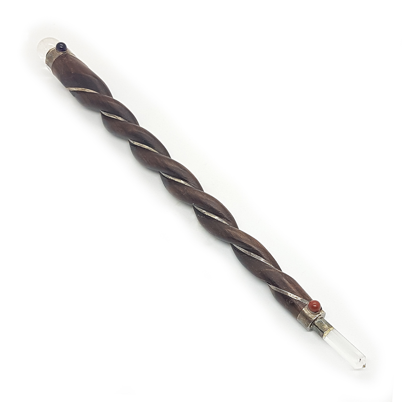 Bergkristallspitze zur exakten Pressur, Bergkristallkugel zum ausleiten, Fassungen aus Silber, die Enden sind verbunden durch ein Silberband