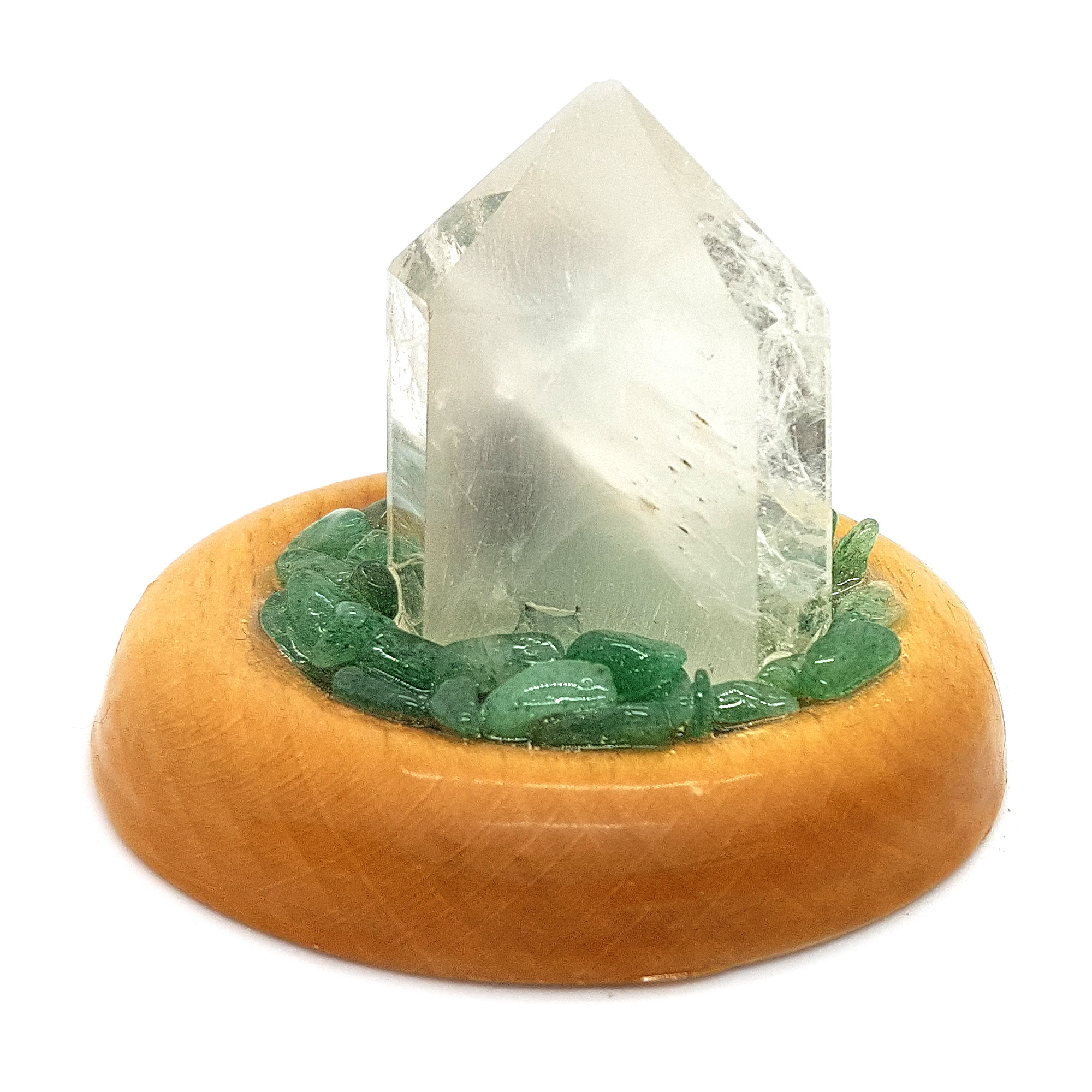Schönes Objekt mit Bronze Buddha, Bergkristall, Aventurin in Holzgefäß
