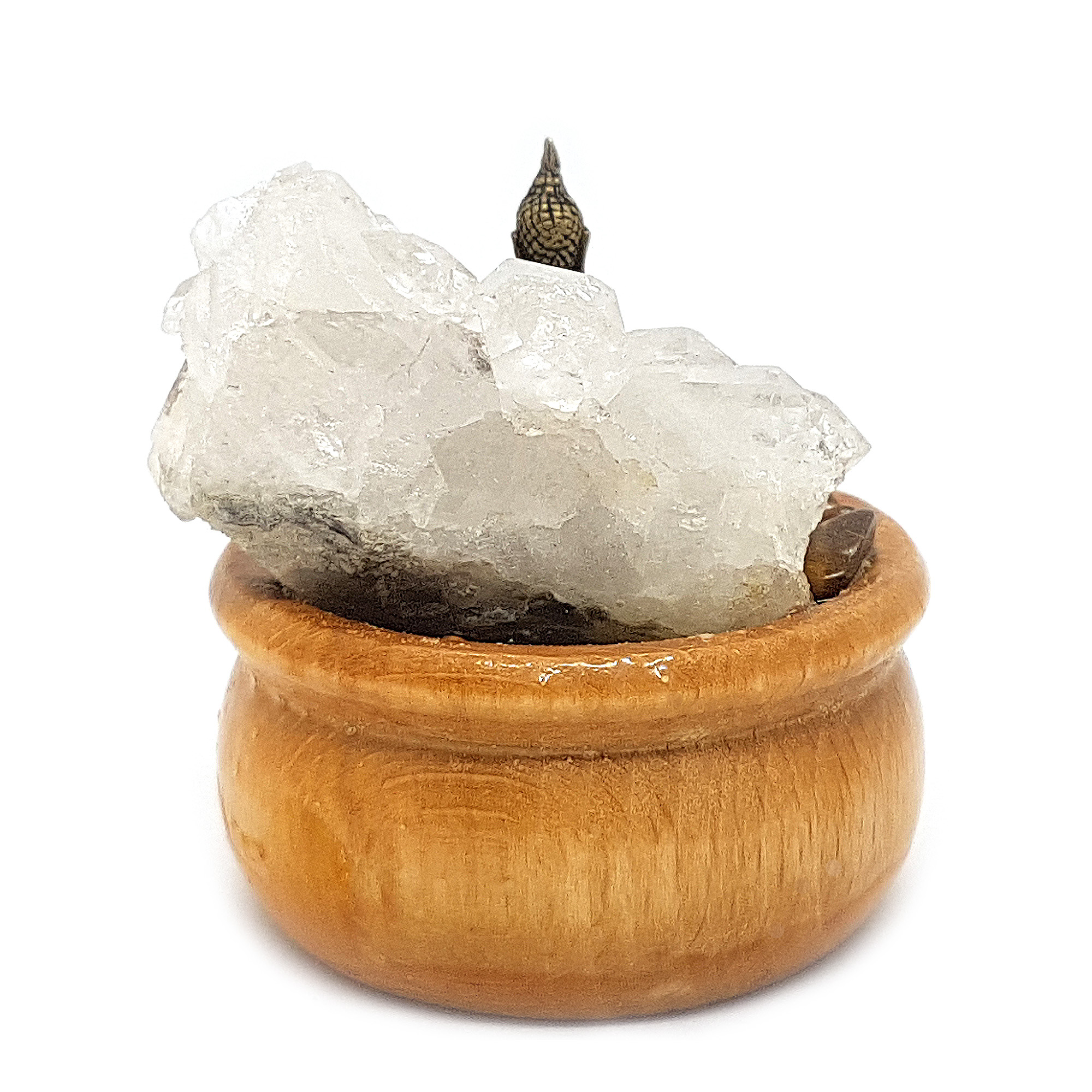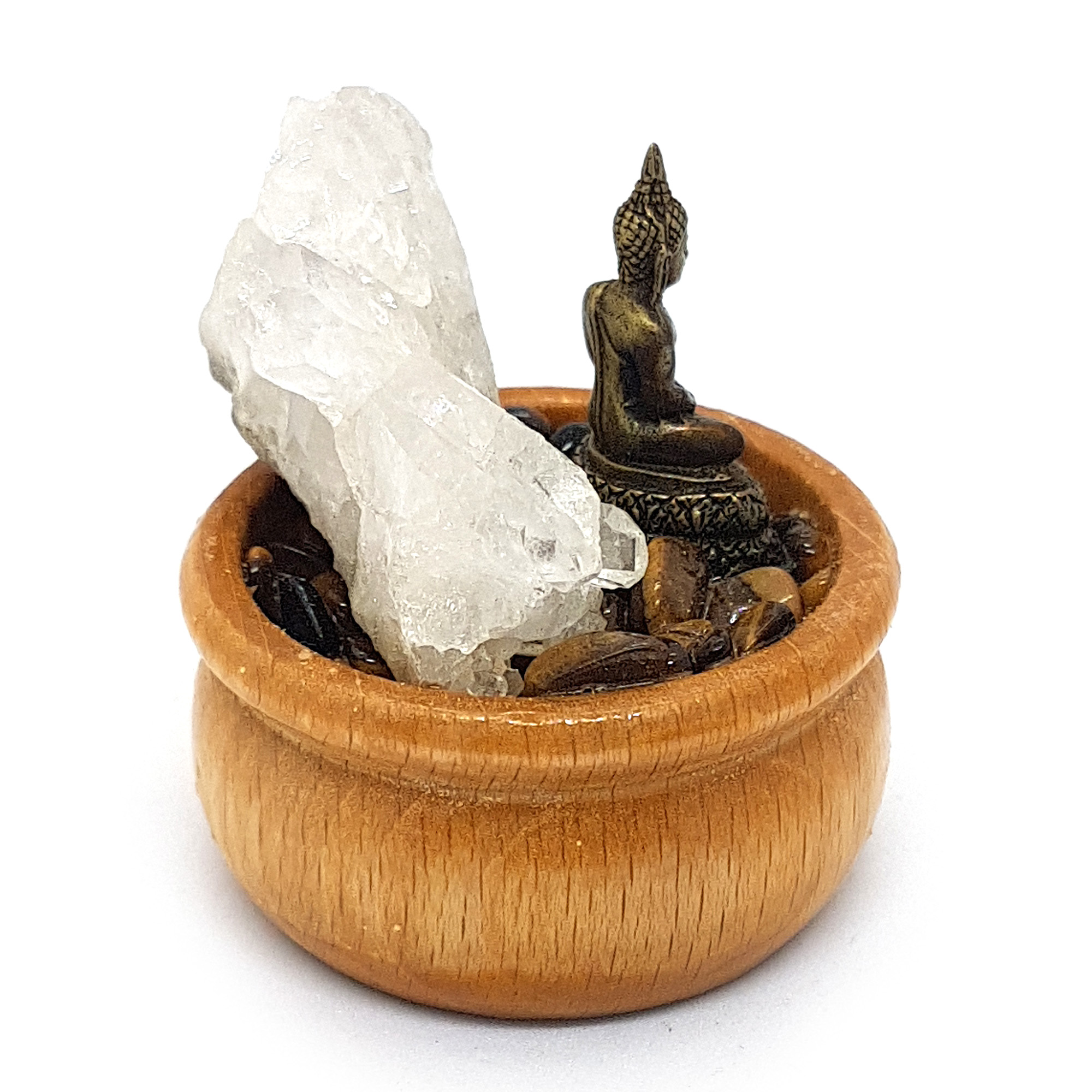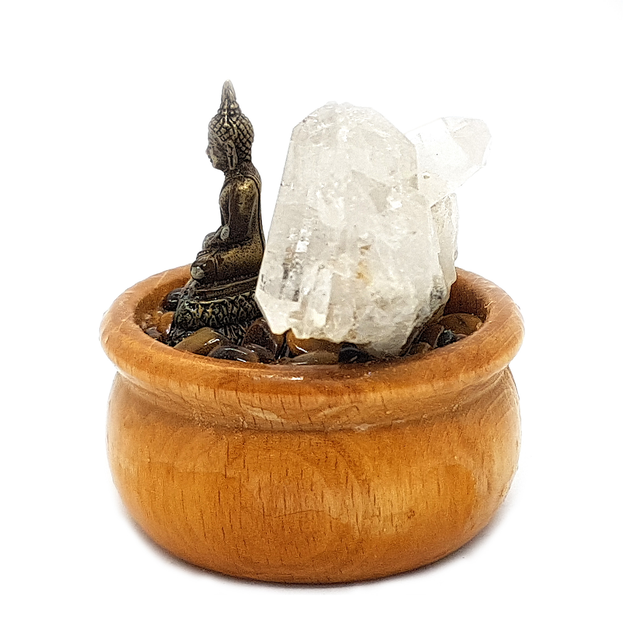 Schönes Objekt mit Messing Buddha, Bergkristall, Tigerauge in Holzgefäß