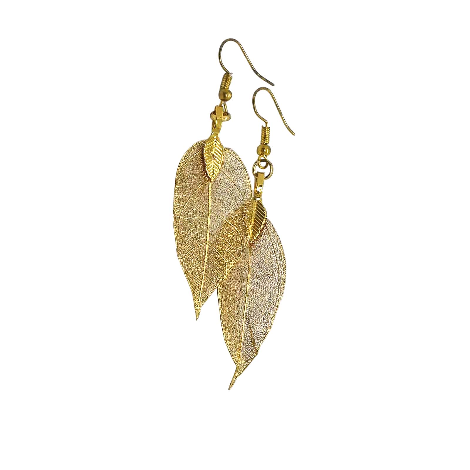 Federleichte Ohrringe die aus einem Blatt erzeugt wurden. Die Blattteile zwischen den Blatt- leitungsbahnen / - adern wurden herausgelöst so dass nur noch die originale Faserstrukturen erhalten blieben. Dann wurde das Blatt galvanisch vergoldet. Jedes Blatt ist ein Einzellstück.