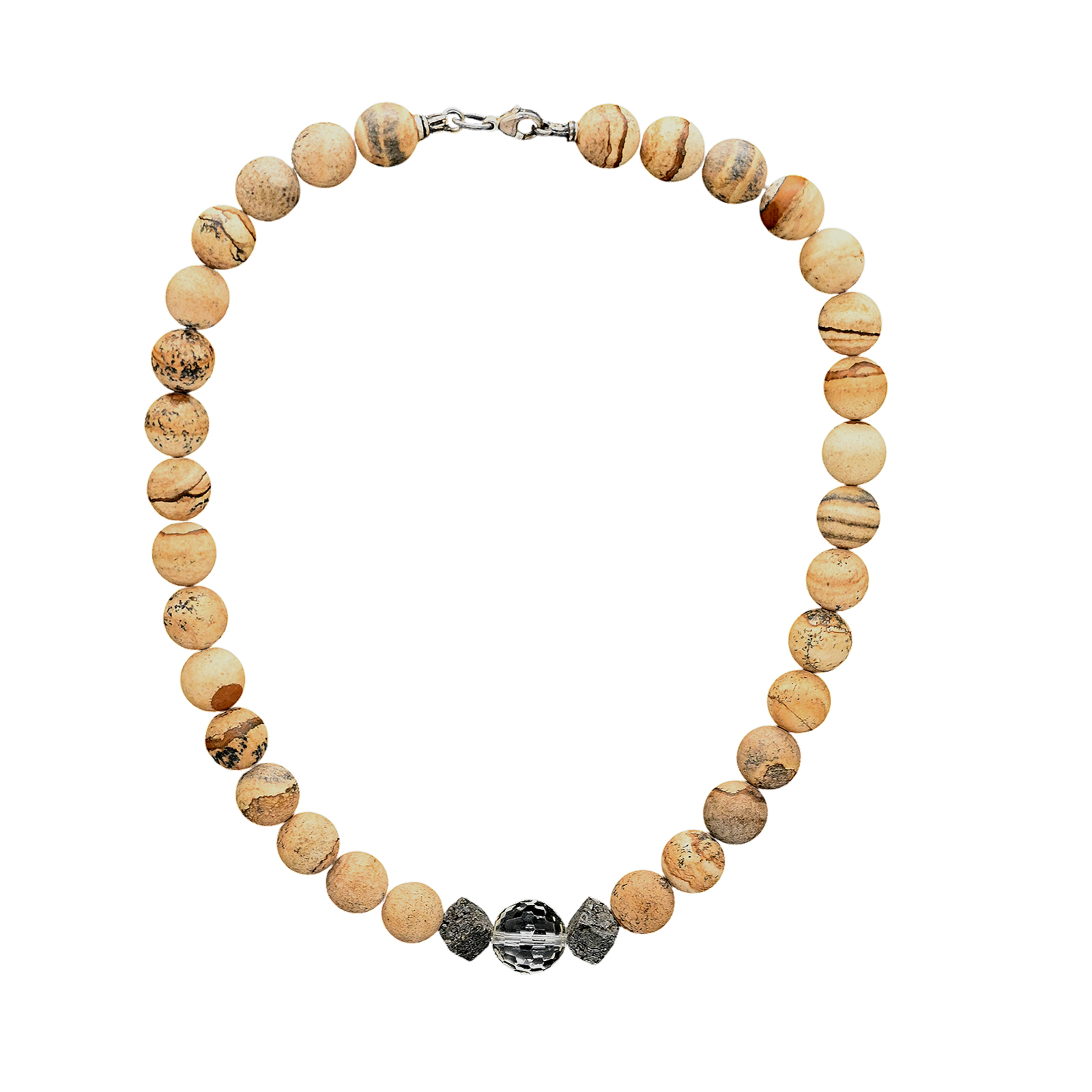 Erleben Sie die natürliche Schönheit des Landschafts Jaspis in dieser exquisiten Halskette. Diese Statement-Kette, gefertigt in Deutschland, präsentiert sich in einem Collier-Stil mit einer Länge von 44 cm. Die 36 Edelsteine spiegeln die Vielfalt der Natur wider und verleihen jedem Outfit einen Hauch von Individualität. Der braunen Ton des Landschafts Jaspis, kombiniert mit der Eleganz des Bergkristalls und der strenge der schwarzen Lava , schaffen ein harmonisches Design, das Sie zu jeder Gelegenheit stilvoll begleitet. Dieses Schmuckstück ist mehr als nur ein Accessoire, es ist ein Ausdruck Ihrer Persönlichkeit und Wertschätzung für Qualität und Handwerkskunst.