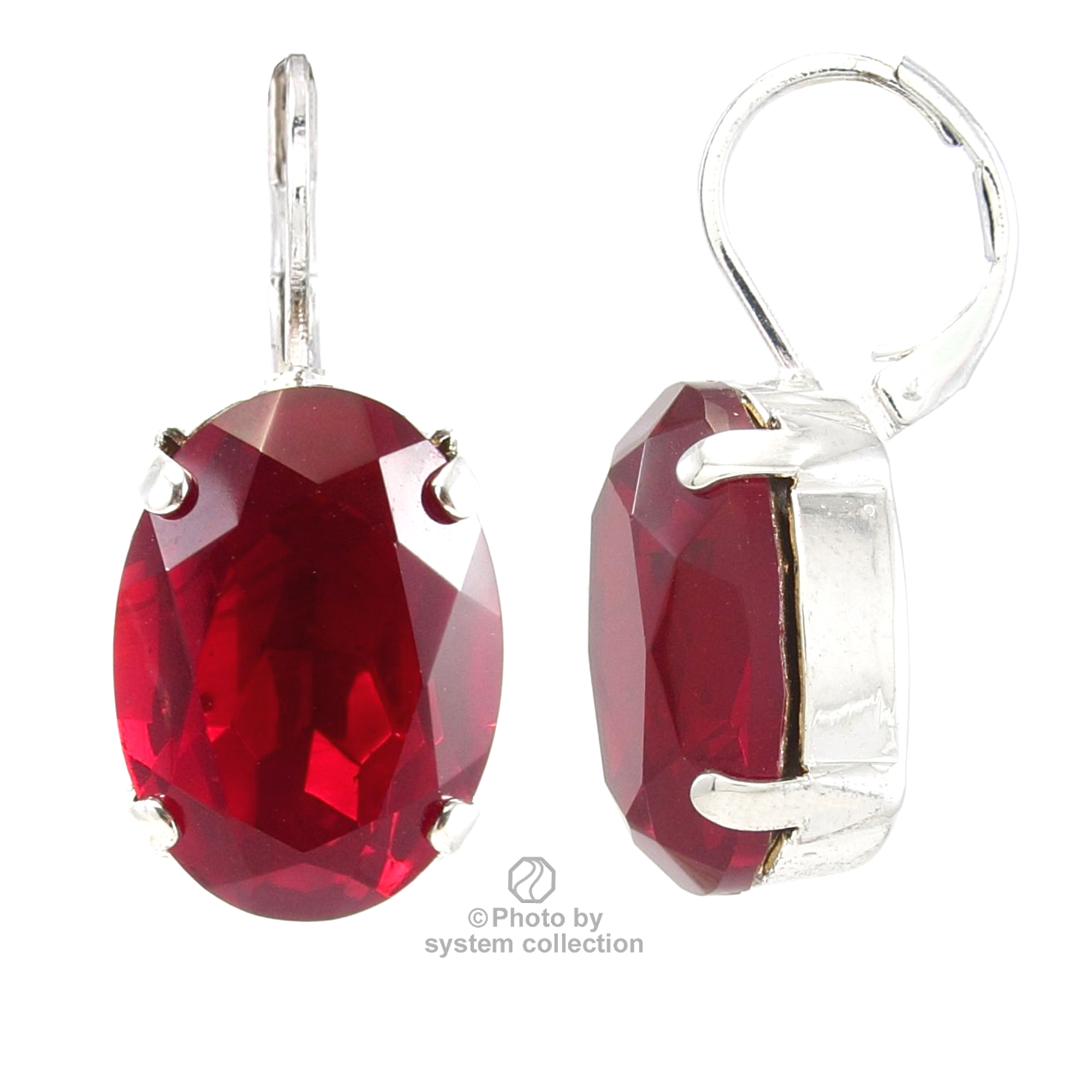 Antiallergene, nickelfreie Ohrhänger aus Tombak (eine hochwertige Messing-Legierung mit einem besonders hohen Kupferanteil) versilbert. Der rubinrote Stein aus Original Vintage Bohemian Glas ist rechteckig und glitzert im klassischen Kissenschliff. Gesamtlänge ca. 30 mm.