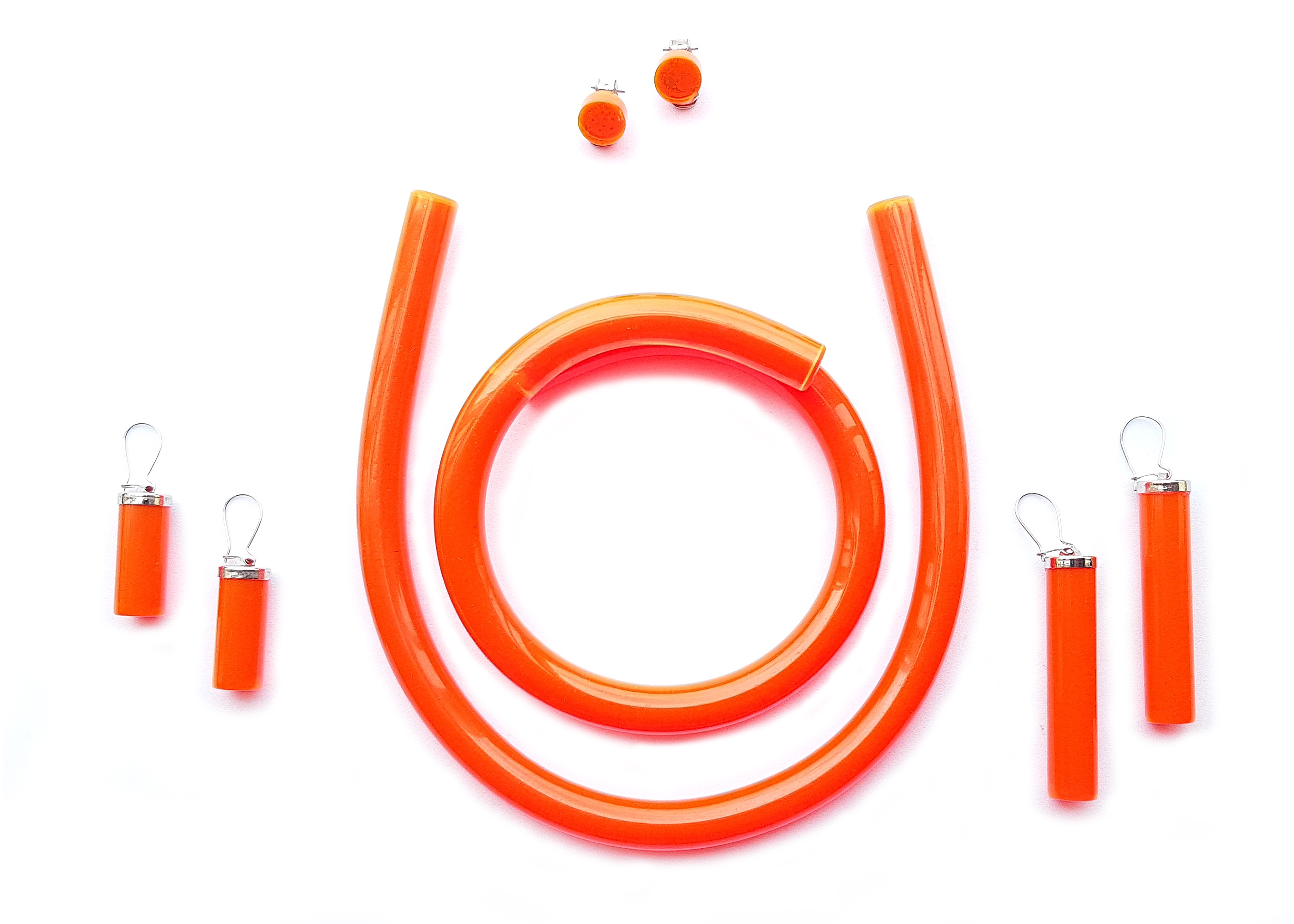 Bestehend aus Halsreifen, Armreif, Langen Ohrringen, Kürzeren Ohrringen und kleinen Ohr Klipps.