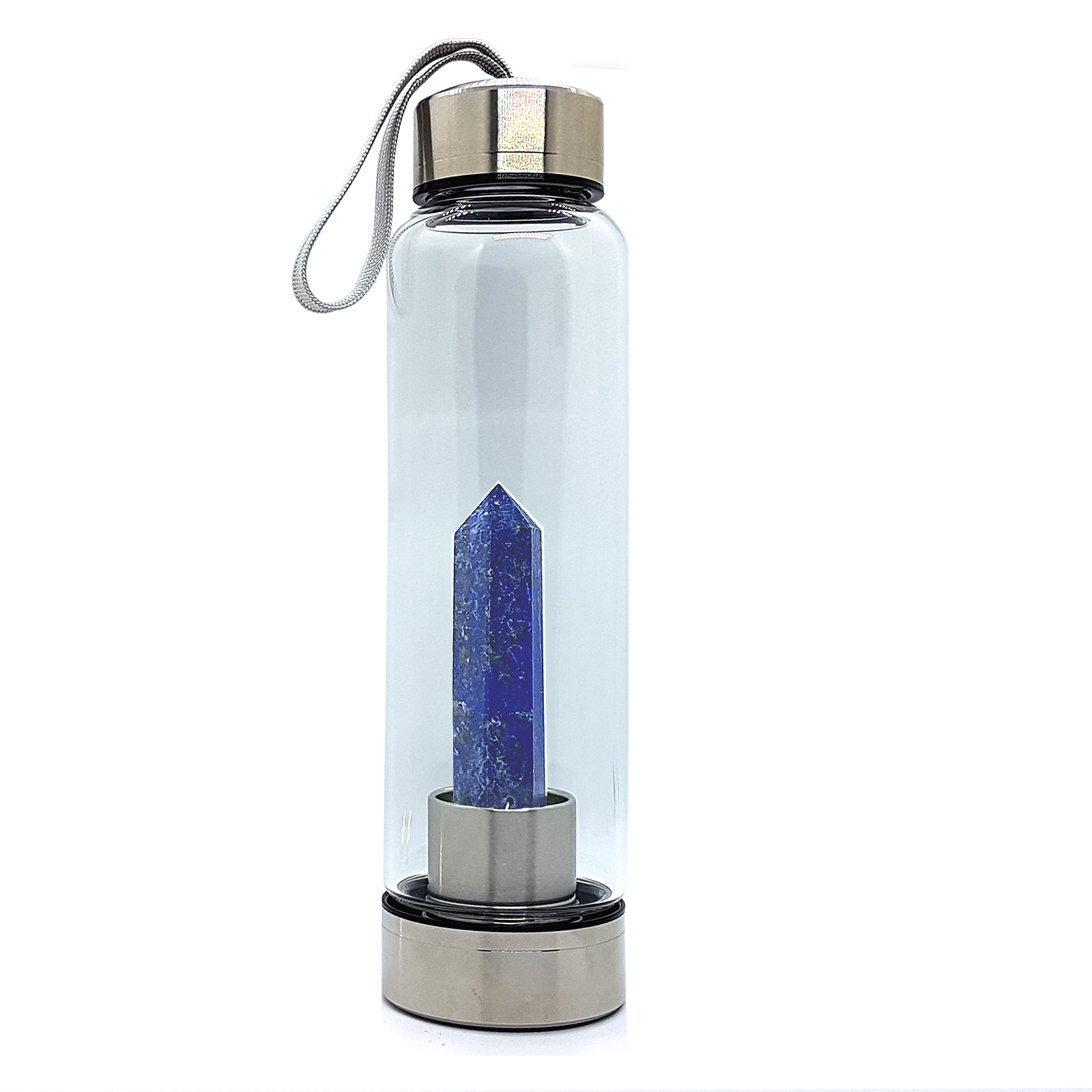 Glas / Edelstahl Trinkflasche für unterwegs mit Lapislazuli in einen Stoff schutz Beutel